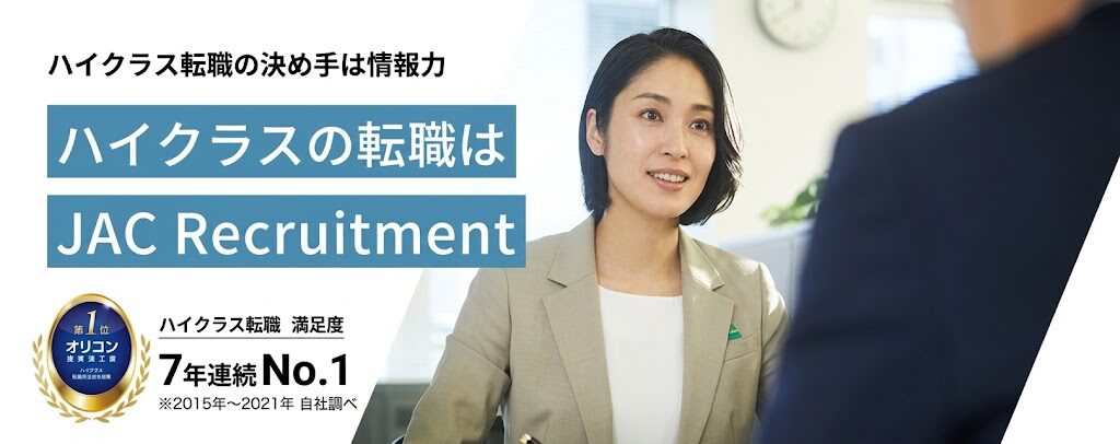 JAC Recruitment(JACリクルートメント)』は、20代後半から50代のミドル・エグゼクティブ層に特化したハイクラス転職エージェントです。1988年創業の歴史ある会社で、長年にわたりハイクラス転職の支援実績を積み重ねてきました。