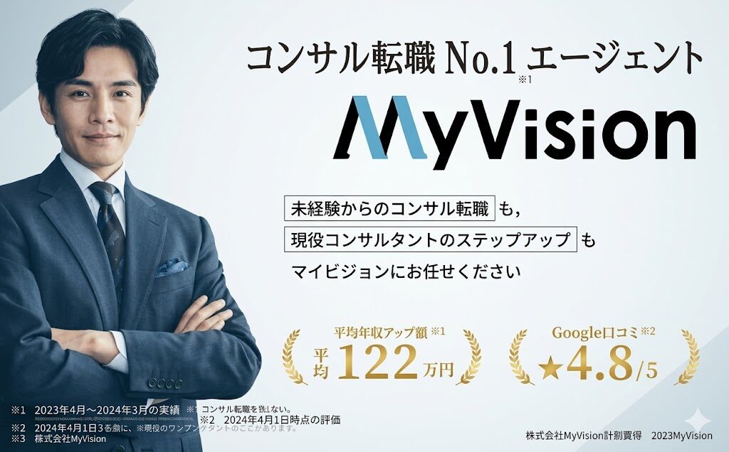 『MyVision(マイビジョン)』はコンサル転職特化エージェントとして知られていますが、コンサル・金融出身者がデベロッパー・事業会社に転職するキャリアチェンジの支援にも対応しています。「コンサルから不動産デベロッパーへ」という転職は近年増加しているルートの一つであり、マイビジョンのアドバイザーはこのキャリアパスのサポート実績を持っています。
